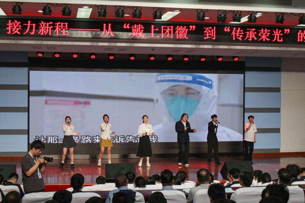 活动在《一路都是歌》的激昂演唱中拉开序幕。在新团员入团宣誓仪式环节,校团委沈楷雯宣读新团员名单,校院二级团委老师为新团员代表佩戴团徽,在领誓人校团委副书记余娜娜的带领下,全体新团员在团旗前庄严宣誓。