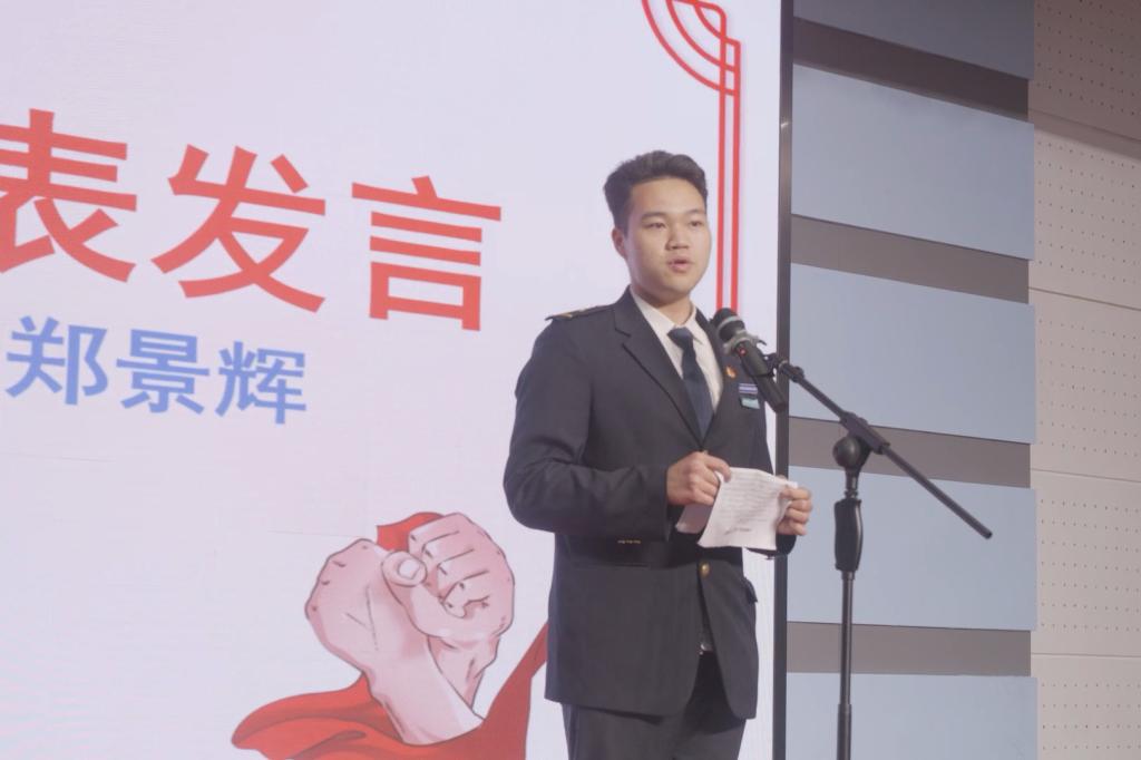 航海工程学院的郑景辉作为新团员代表发言,表达了以团徽为使命、以行动践行初心的决心。