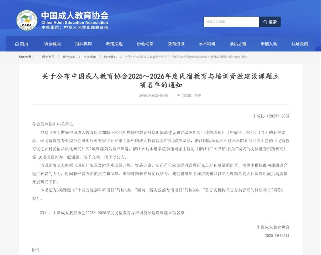 近日,中国成人教育协会公布了2025—2026年度民宿教育与培训资源建设课题立项名单,我校共有2项课题获批立项。其中,孔洁老师主持的课题《民宿教育促进乡村民宿品质化研究》被立为重点课题;谷云华老师主持的课题《中华优秀传统文化融入民宿的路径与实效研究》被立为一般课题。