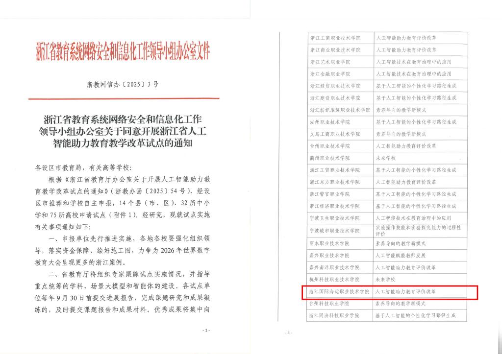 近日,浙江省教育系统网络安全和信息化工作领导小组办公室正式公布了浙江省人工智能助力教育教学改革试点名单,我校凭借在人工智能教育应用领域的探索及成效,成功入选。此次入选不仅标志着学校在“数智海运”建设上的又一重要成绩,也是迈向高职教育与人工智能深度融合的教育教学新模式又一重要里程碑。