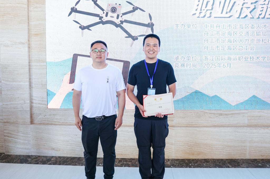 经过一天紧张角逐,叶伟明等6名选手分获一、二、三等奖。我校海洋装备工程学院王庆老师荣获三等奖(第4名)好成绩,根据文件可被授予“定海名匠”荣誉称号,另有3位老师荣获优胜奖,各项成绩合格的优胜奖及以上选手可获得相关部门核发的无人机驾驶员(巡检无人机驾驶员)高级工(三级)技能等级证书。
