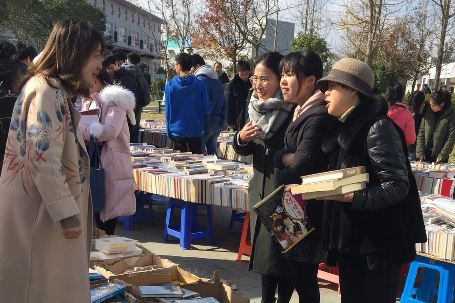12月12日中午,我校图书馆与江苏书商在学生食堂商贸区联合举办图书展销活动。冬日的暖阳照着堆放整齐的推理小说、中外名著、人文经典等各类图书,吸引了大批师生驻足阅读、交流、购书,在学校掀起了一股浓厚的读书热潮。