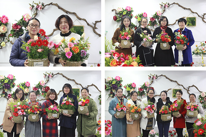 从插花工具开始,翁名媛介绍了花材、叶材的修剪处理,插花基本结构和基本造型技法。老师们在翁老师的指导下,经过一个多小时,创作出了一盆盆灿烂缤纷、新颖别致的插花作品。看着新鲜“出炉”的美丽鲜花,教师们笑靥如花。