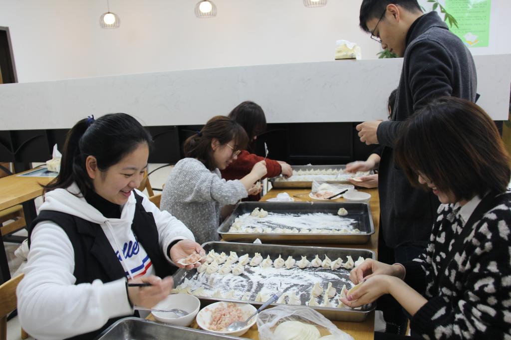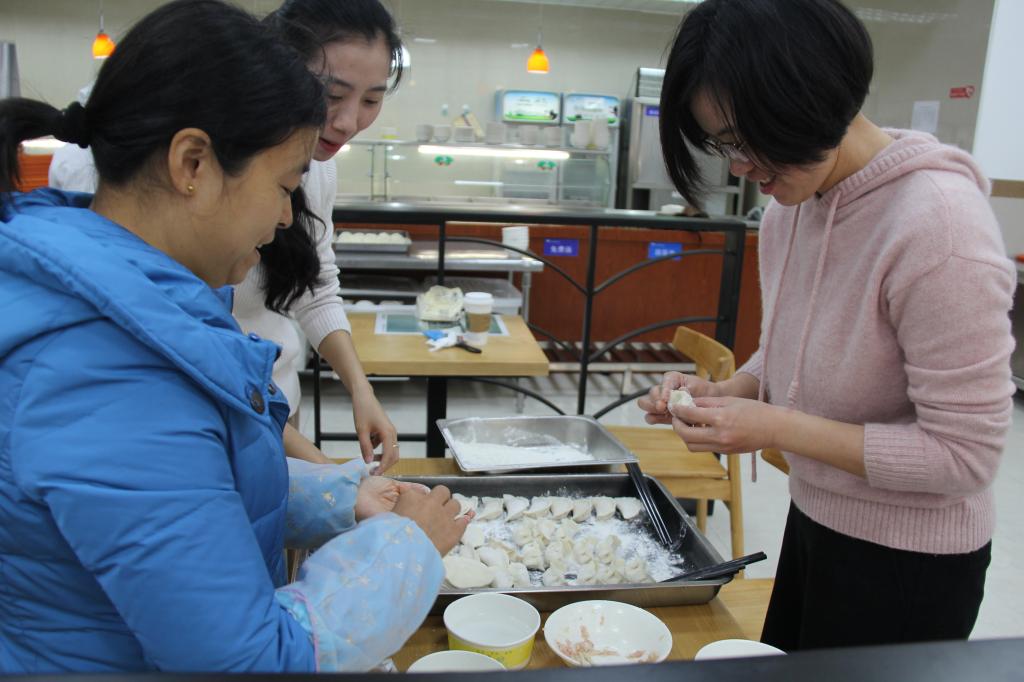 活动中,女同胞们个个热情高涨,摩拳擦掌,围坐一起展示包饺子手艺。男同胞们也踊跃参与其中露一手。现场欢声笑语,其乐融融。不一会儿功夫,一笼笼白嫩嫩如元宝般的饺子就包好了,紧接着一盘盘热气腾腾、香喷喷的煎饺、蒸饺、煮饺纷纷端上桌,全体教职工们一起分享着,快乐着。