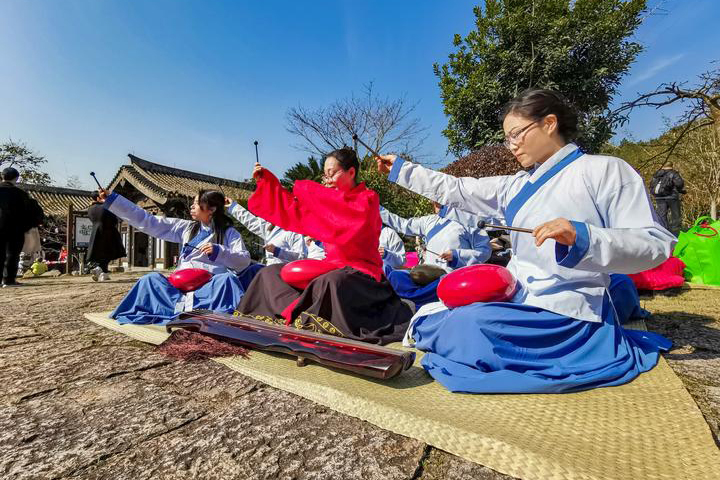 一大早,国学社的志愿者们就来到沈院布置会场,待穿着各色汉服的国学爱好者们陆续来到现场后,社员们也换上汉服和参加活动的市民们一起,开展了敲击空鼓、传统茶艺“仿宋点茶法”学习、编织花环、写祝福彩带祈福等活动。各种传统习俗体验让前来参加活动的市民们更加深入了解了我国传统文化。(图文/林芷伊)