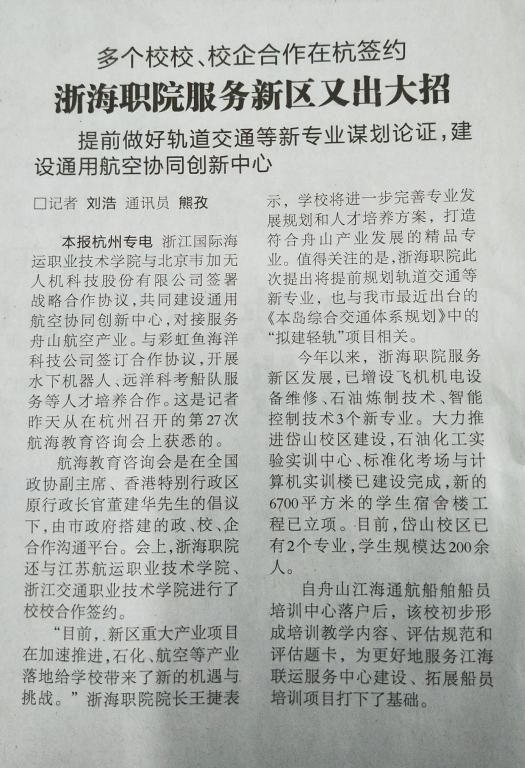“目前,新区重大产业项目在加速推进,石化、航空等产业落地给学校带来了新的机遇与挑战。”浙海职院院长王捷表示,学校将进一步完善专业发展规划和人才培养方案,打造符合舟山产业发展的精品专业。值得关注的是,浙海职院此次提出将提前规划轨道交通等新专业,也与我市最近出台的《本岛综合交通体系规划》中的“拟建轻轨”项目相关。