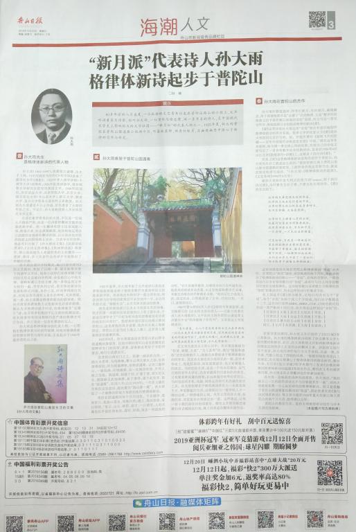 《舟山日报》:“新月派”代表诗人孙大雨 格律体新诗起步于普陀山
