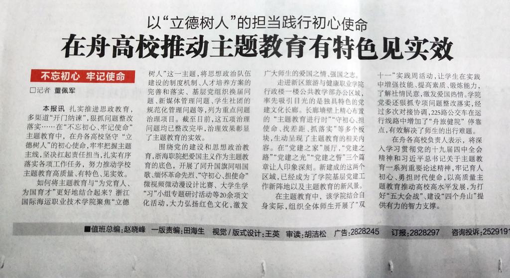 扎实推进思政教育,多渠道“开门纳谏”,狠抓问题整改落实……在“不忘初心、牢记使命”主题教育中,在舟各高校坚守“立德树人”的初心使命,牢牢把握主题主线,坚决扛起责任担当,扎实有序落实各项工作任务,努力推动学校主题教育高质量、有特色、见实效。