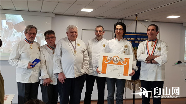 法国当地时间2月22日下午,法国餐饮学会在巴黎蓝带厨艺学院举行授勋仪式,来自浙江舟山的鲍飞跃,从学会主席Fabrice Prochasson手中接受入会勋章和证书,成为首位加入法国餐饮学会的中国籍主厨。
