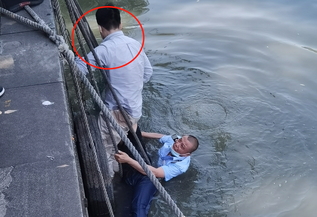期间,陈瀚涛奋力拖拽了10多分钟,仍然无法将落水者彻底救出,期间围观群众虽然送来绳索、救生圈等物品,但是单手拉拽的他,已近力竭,幸好此时另一位船老大及时帮助,众人合力将女子救上船。