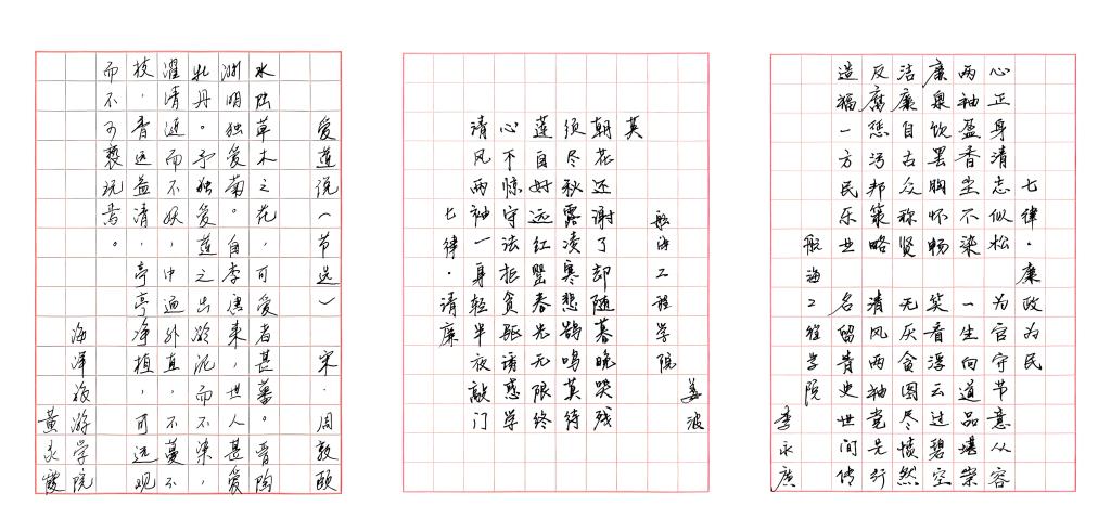 比赛项目分为书法和绘画两大类,各位参赛选手围绕“清风扬正气”这一主题,各展所长,创作作品涵盖了毛笔书法、硬笔书法、国画、渔民画、蜡笔画等。参赛教师们功底深厚,每一笔一划都透露出他们对廉洁文化的深刻理解和崇高敬意;参赛学生们则以其纯真的情感和独特的视角,书写描绘出对廉洁文化的朴素理解和美好向往。经过评委老师的认真评选,颜天明老师荣获教师书法组冠军,罗兰和孙含笑老师的画作获教师绘画组的优秀作品奖,海洋旅游学院的龚蕊同学荣获学生书法组冠军,国际教育学院的李妙同学获得学生非专业绘画组冠军。